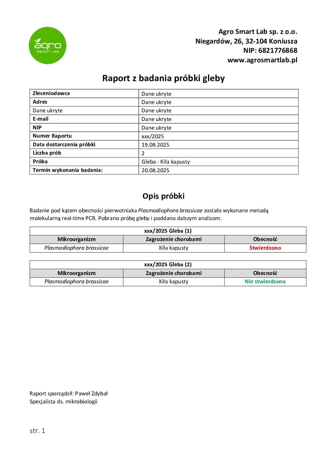 Przykładowy raport z badania gleby pod kątem wystąpienia Plasmodiophora brassicae (sprawca kiły kapusty)