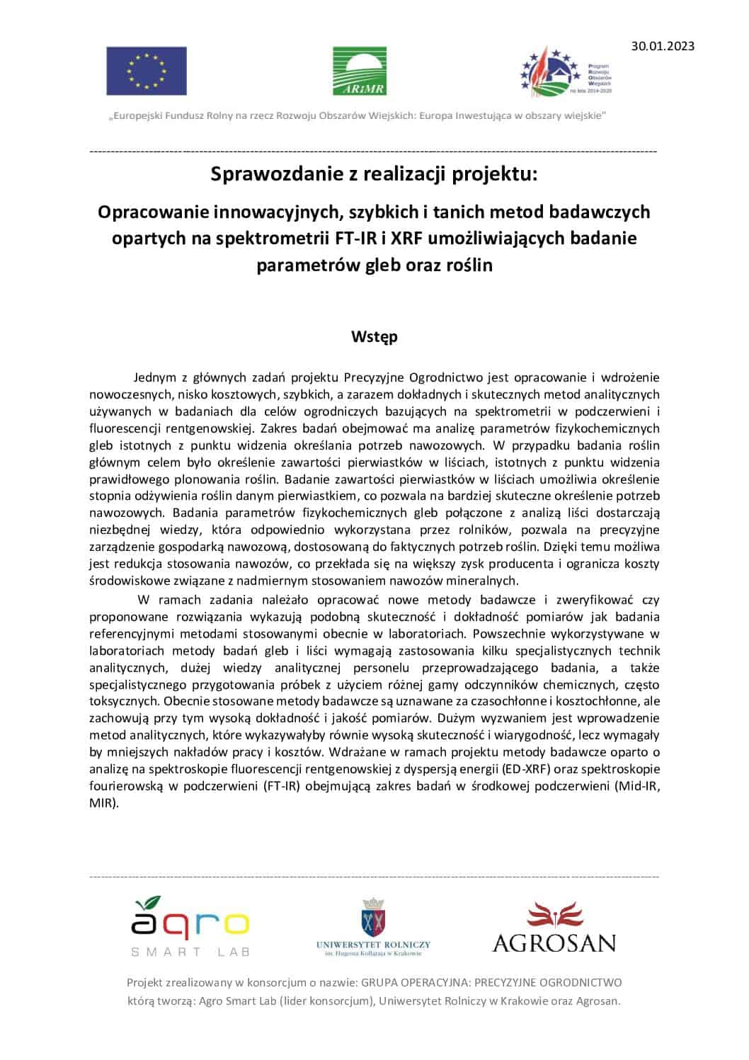 - Opracowanie innowacyjnej na polskim rynku metody szybkiego badania gleby i roślin na zawartość makro- oraz mikroelementów za pomocą spektrometrii XRF, FTIR, ICP